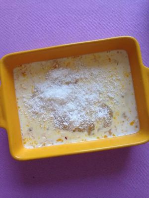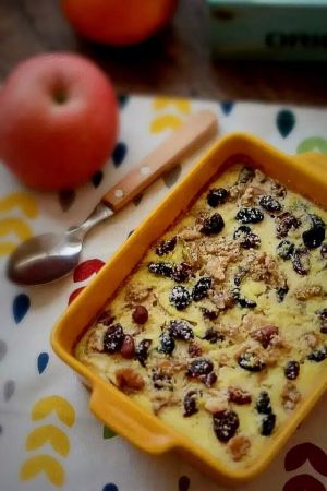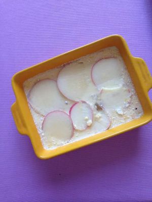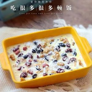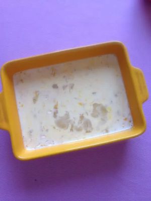 将鸡蛋、牛奶、燕麦片倒进烤盘或者烤碗,充分拌匀。