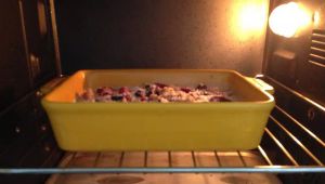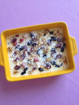 搅匀的撒上喜欢的果干,我用了核桃仁、黑加仑、蔓越莓干、蓝莓干、松子仁。(果干根据个人喜好随意搭配)。表面再撒一层椰蓉。