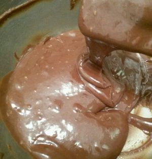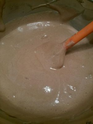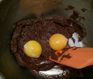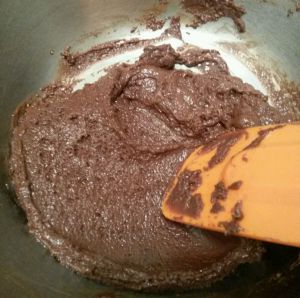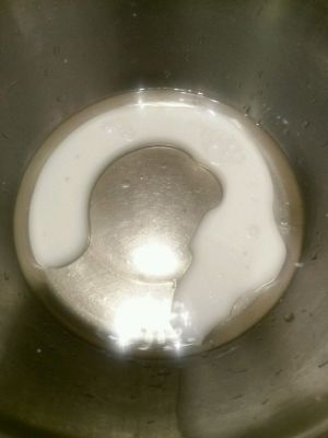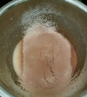 可可戚风材料中的牛奶和玉米油倒入盘中,打蛋器搅拌至乳化