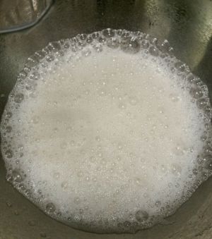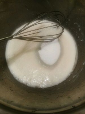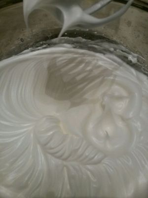 无油无水的盘放入蛋清,打发至粗泡后加入一两滴柠檬汁和三分之一细砂糖