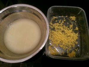 用柠檬筛筛出柠檬皮屑,尽量不要筛到白色内皮。榨出柠檬汁备用
