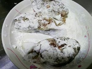 每一块鲅鱼反正轻轻的拍上一层淀粉
