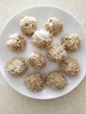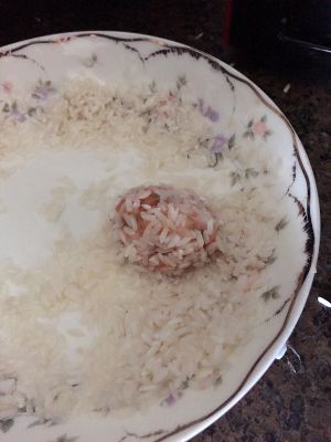 糯米泡水后沥干 摊于碟中 将调好的肉碎搓成一个小丸子 在糯米上滚一滚 有人觉得糯米不好消化 那就不要滚太多 我是很爱糯米的 所以滚的比较多