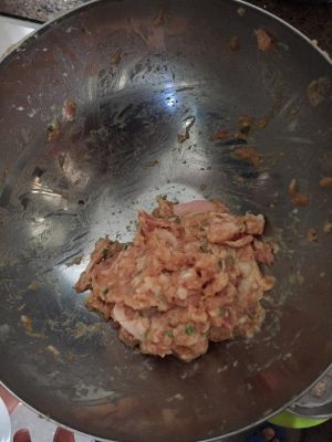 肉搅拌机弄碎 调料 蚝油 葱 胡椒粉 生粉 葱 一起搅拌 使之入味 如果喜欢口味重点 可以加一丝盐