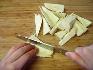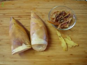 金华火腿切片稍稍冲洗干净,生姜切片,冬笋剥去笋衣;