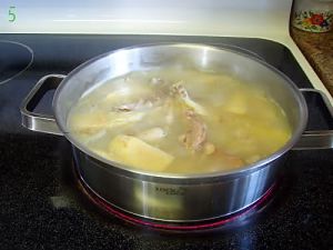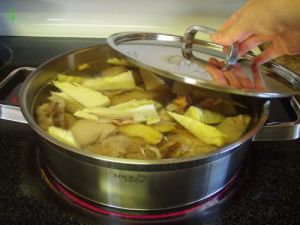 盖上盖子,大火煮开,转中小火慢炖至汤汁浓稠发白即可,大概需时3-4小时,起锅前加入少量盐调味即可。