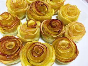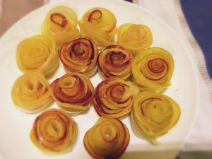 苹果片粘在面条上,从一端开始卷