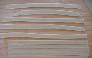 和面,发酵到一倍大,擀皮,切1.5厘米条