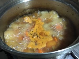 西红柿炒软烂以后,加800ml水,土豆,胡萝卜及所有材料(除了大头菜和淡奶油),大火煮开后,改小火先炖半小时。