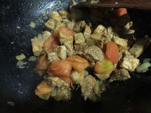 洋葱炒香后,放入牛肉,加入一勺酱油炒色,然后放入西红柿。