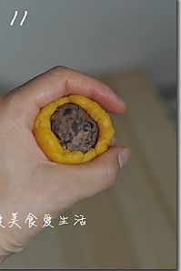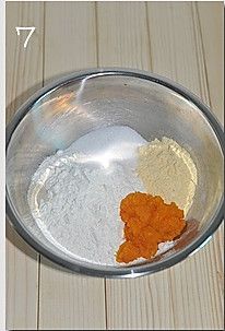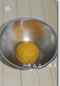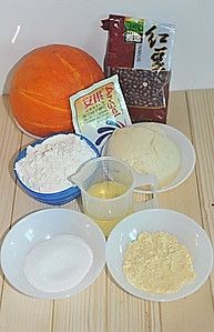 金瓜事先去皮蒸熟捣成泥。将面粉、玉米面、色拉油75g、白砂糖20g、酵母、小苏打和金瓜泥混合搅拌。