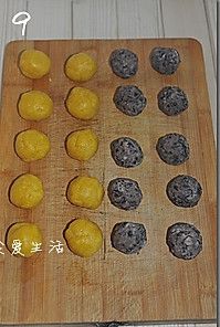 将饼皮面团分成30g一个小剂子,馅料分成25g一个团成小圆球。
