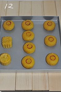 稍稍按压扁,用小瓶子盖蘸红色食用色素在月饼胚上盖个圆印,入预热好的烤箱,180度中层烤10分钟即可。(当然你也可以用月饼模具做出各种形状的杂粮月饼)