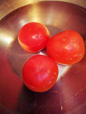 番茄底部用刀划十字,用热水烫一烫,外皮开始脱落就可以撕掉了