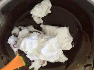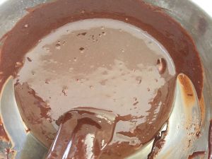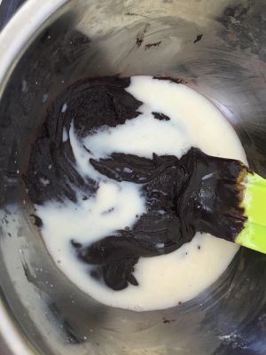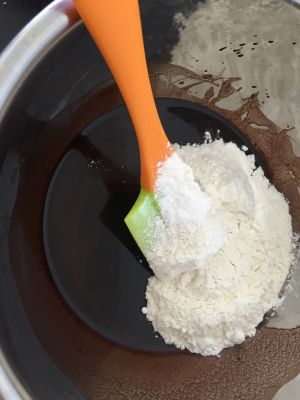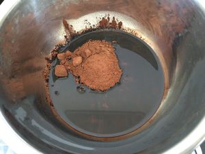 玉米油隔水加热,倒入可可粉。搅拌均匀。可可粉不容易溶化。所以把油加热用好一些。