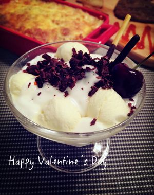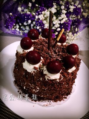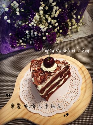 做好的黑森林蛋糕。粘巧克力碎的时候 用勺子。蛋糕表面筛一些糖粉。