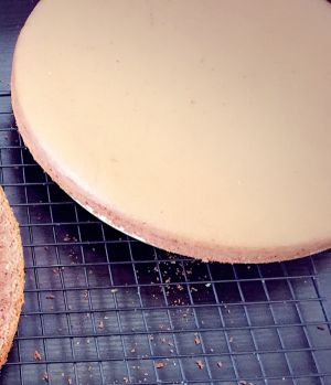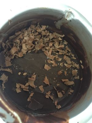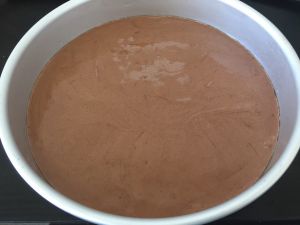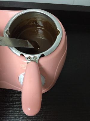 溶化巧克力。可以用盘子隔水溶化。彻底融化 无颗粒后晾凉待用