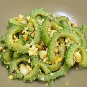 放入苦瓜翻炒,放入盐和五香粉调味,炒至断生~