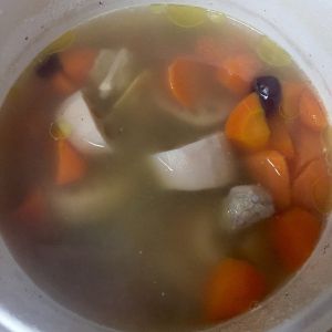 再过半小时加胡萝卜。所有材料入锅,加盐。注意,盐一定要后加,先加肉会硬。盐不要多,喝汤的,调味即可。胡萝卜切滚刀块。