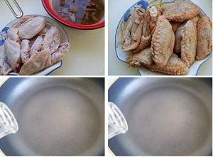 锅置火上,放油,烧至5成。放腌好的鸡翅,煎至两面金黄。