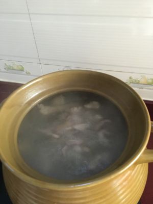 猪肚、鸡、姜片、胡椒粒进锅加水煲,大火开后转小火