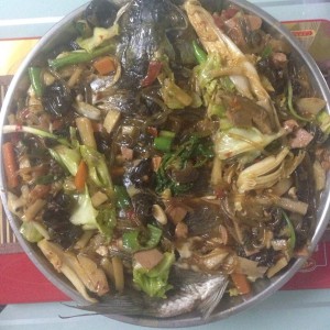 然后把菜垫底,鱼放上面,把酱汁均匀淋到鱼身,摆上香菜葱!!