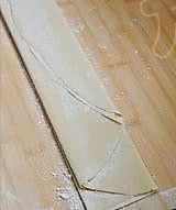 擀成厚度不超过0.3mm的薄面片。(若面板不够大,则先把饧好的面团分成两份,一份份的擀开)