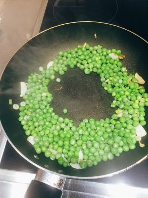 葱姜蒜爆锅,先炒青豆,表面开始变色后一会下鸡丁,快速滑炒鸡丁