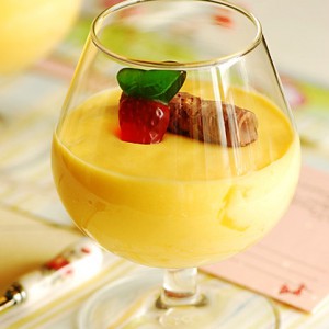 等做法3的奶汁放凉后,加入做法2的果泥中,加入剩余的芒果丁,拌匀,放入容器(或模具)入冰箱冷藏3小时即成