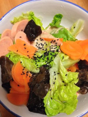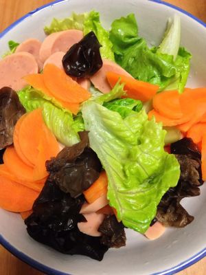 生菜洗净撕小片,胡萝卜切片,木耳撕小朵,把木耳,胡萝卜放滚水中烫一分钟,火腿肠切片。所有材料放入大碗。