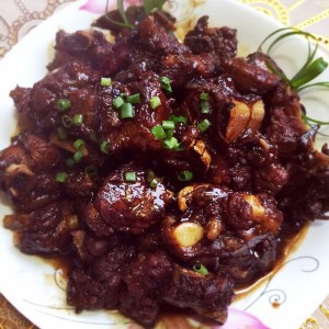 加入少许老抽和生抽,翻炒几下让排骨上色。