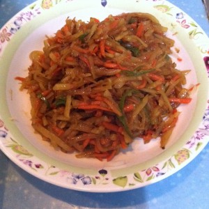 加鸡精和辣椒粉继续翻炒,出锅前加盐调味