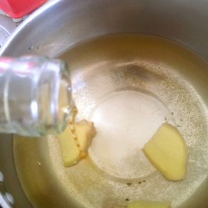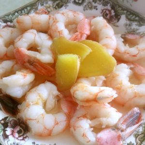 水中加入料酒和姜片,可以帮助去除腥味,如果虾仁很新鲜,也可省略。水开后加入虾仁,汆烫两分钟虾仁变色即可。