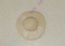 .取过一个卷坯,用擀面杖擀开接近圆形,包入枣泥馅,收口捏紧