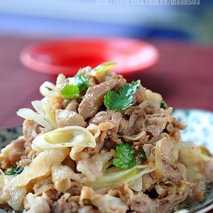 看到羊肉卷开始变软,有一部分开始变色,倒入大葱白片。