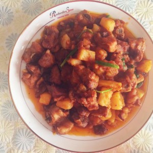 待排骨至金黄色后放入姜蒜,豆瓣爆炒后倒入土豆,水适量,盖上锅盖煮7-8分钟加盐,鸡精,生抽。翻炒后放入葱段