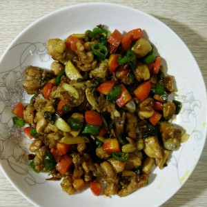 加入鸡丁。翻炒两分钟,加入盐,酱油上色,加一点点醋,还有一点白糖。再翻炒一分钟,就可以出锅啦