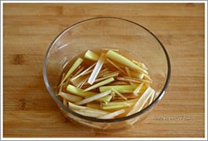 准备葱姜,将葱姜切丝,将切好的葱姜丝放到碗里,加入料酒.再加入盐,将葱姜丝.料酒.盐拌匀