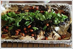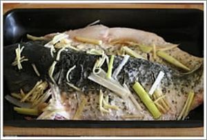 准备一个深点的烤盘.铺上锡纸,盘底铺上洋葱,再铺上土豆片,最后放上腌了20分钟的鲤鱼,入烤箱中层200度烤20分钟,20分钟后拿出烤鱼.撒上炒好的豆豉调料,二次入烤箱中层200度20分钟.20分钟后从烤箱中拿出烤鱼撒上炒好的花生米,最后撒上香菜碎点缀即可