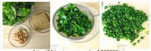 将香芹的嫩叶摘下洗净,入沸水中焯一下捞出切碎。