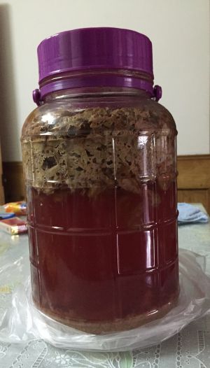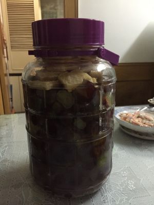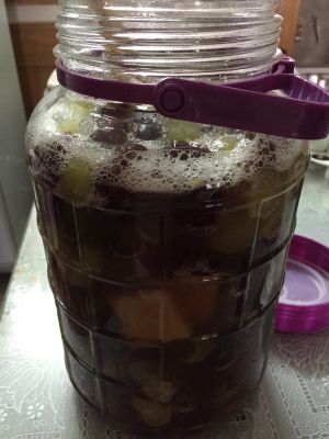 葡萄撕一小口也可以捏碎冰糖放最上面,水果酵母1克用30~40度得水溶化冷却倒入瓶中,再用筷子搅拌一下