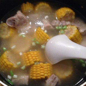 起锅的时候放1勺半鸡精调味,切少许葱花,这碗汤耗时1个半小时,小火慢炖,汤味道十分鲜美,肉软烂适中,玉米香甜,吃起来很爽口。(照片比较模糊,顾着喝汤了)