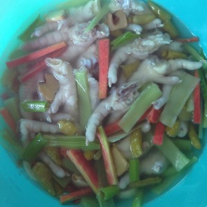 清水煮开,下凤爪.姜.花椒.和适量料酒提鲜,撇去上面一层蒙状物,煮10~15分钟(根据个人喜好煮软或硬)。煮好的凤爪用冷水冲洗