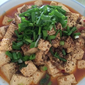 锅中油热后将蒜末、适量豆瓣倒入,大火爆香后放入肉末,翻炒至肉末变色倒入豆腐及少量冷水、盐,大火收汁。剩盘洒上花椒粉,葱花,即可。