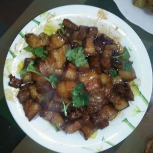 用炒锅放油,油熟了放冰糖,小火,糖化了把肉倒进去,把肉全都粘上糖,放进葱,姜,大料,酱油炒一下,倒适量的水,小火炖上色,大火收汁,出锅,撒上香菜,即可!