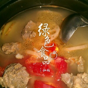 排骨、莲藕、姜片一块放砂锅添水八分满大火煮开小火煮30分钟下番茄滚一滚放盐关火
