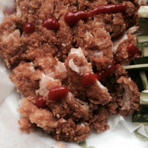 黄瓜切条和鸡排一起入盘,挤入番茄酱。