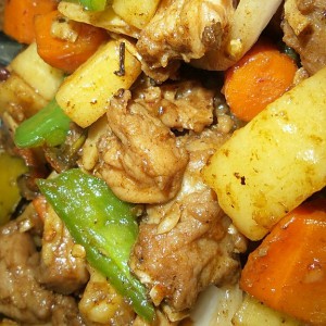 热锅 大火放两勺油,放入葱姜蒜多点,(口味重的可以再放点八角花椒红辣椒)炒香,放腌制好的鸡肉,翻炒几分钟,放料酒,酱油,再一直翻炒,干锅的话就放点水,〈也可以拿可乐代替水,味道更好,只是有点微甜〉颜色不好看的话可以再放入少去酱油,这时可以放入土豆胡萝卜了,再翻炒几下,盖锅盖闷制!