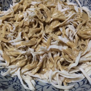 煮熟的鸡大胸用凉水冲干净沫子,用手沿着肉纹理撕成5mm内的细条