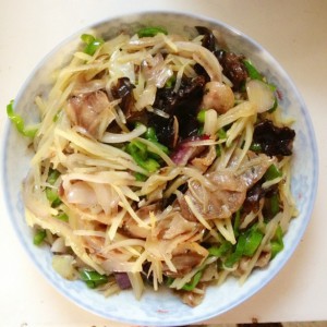 待香肠炒至透明,加入木耳和土豆丝,加少许糖和盐,快炒(香肠是咸的,所以盐不要加太多)
